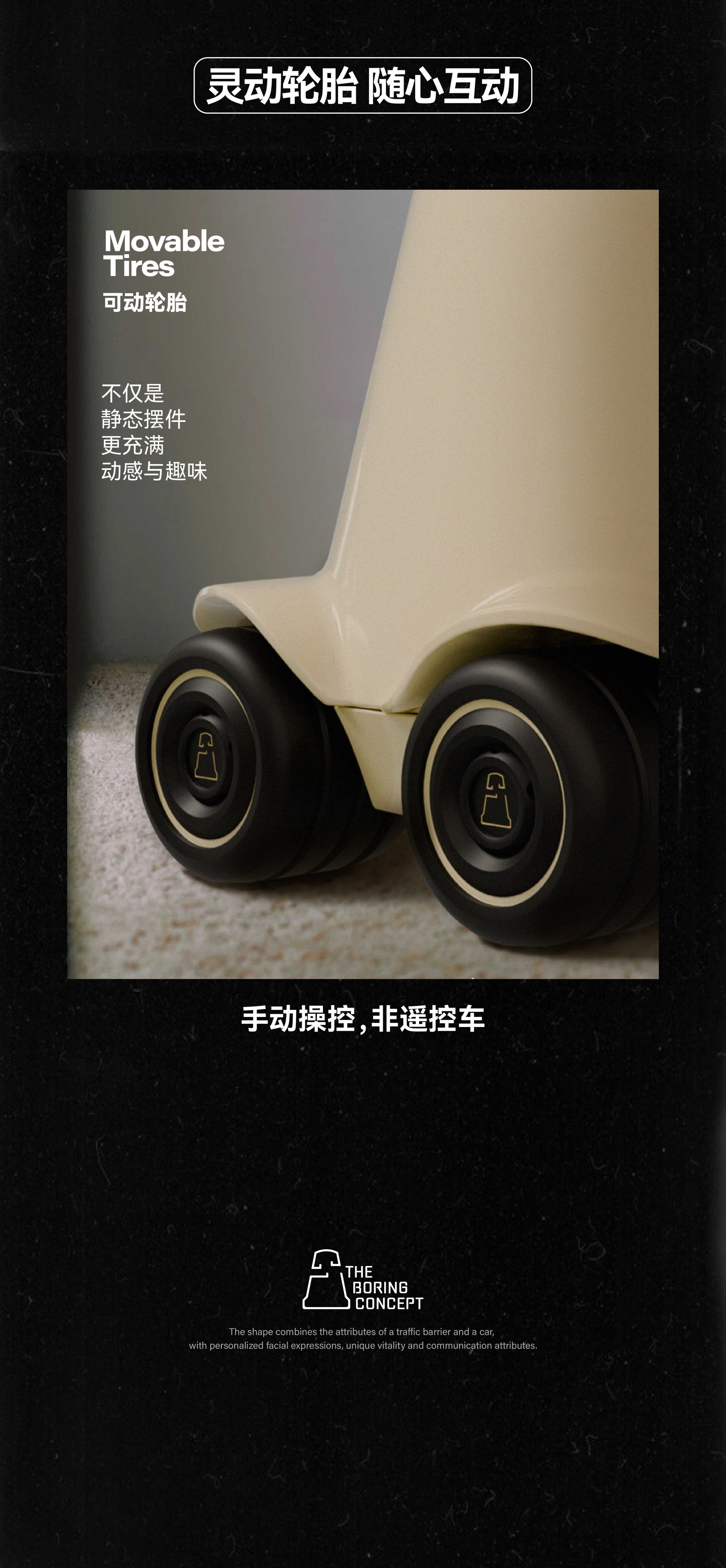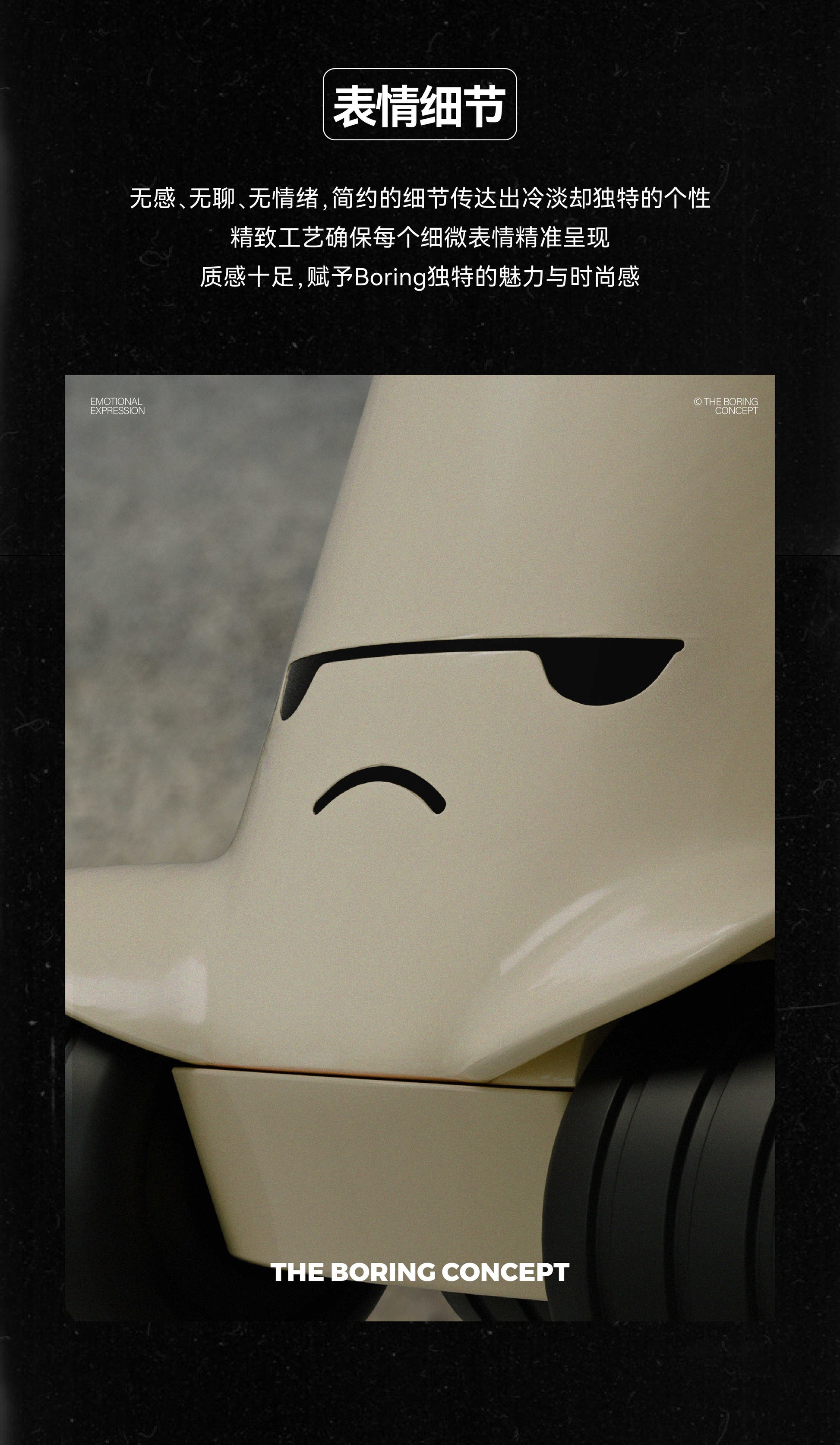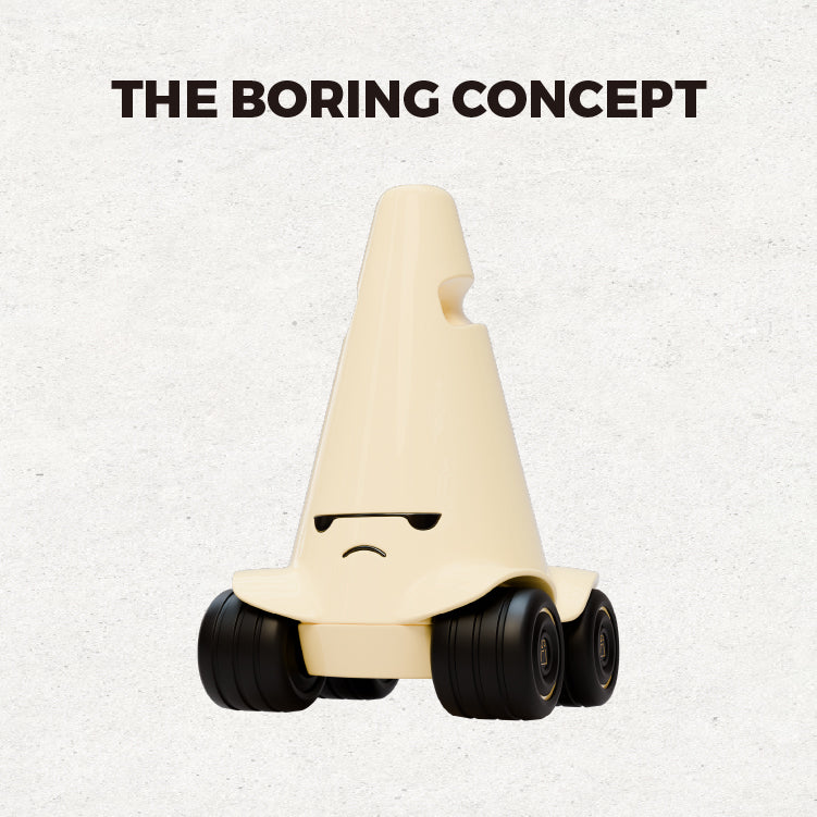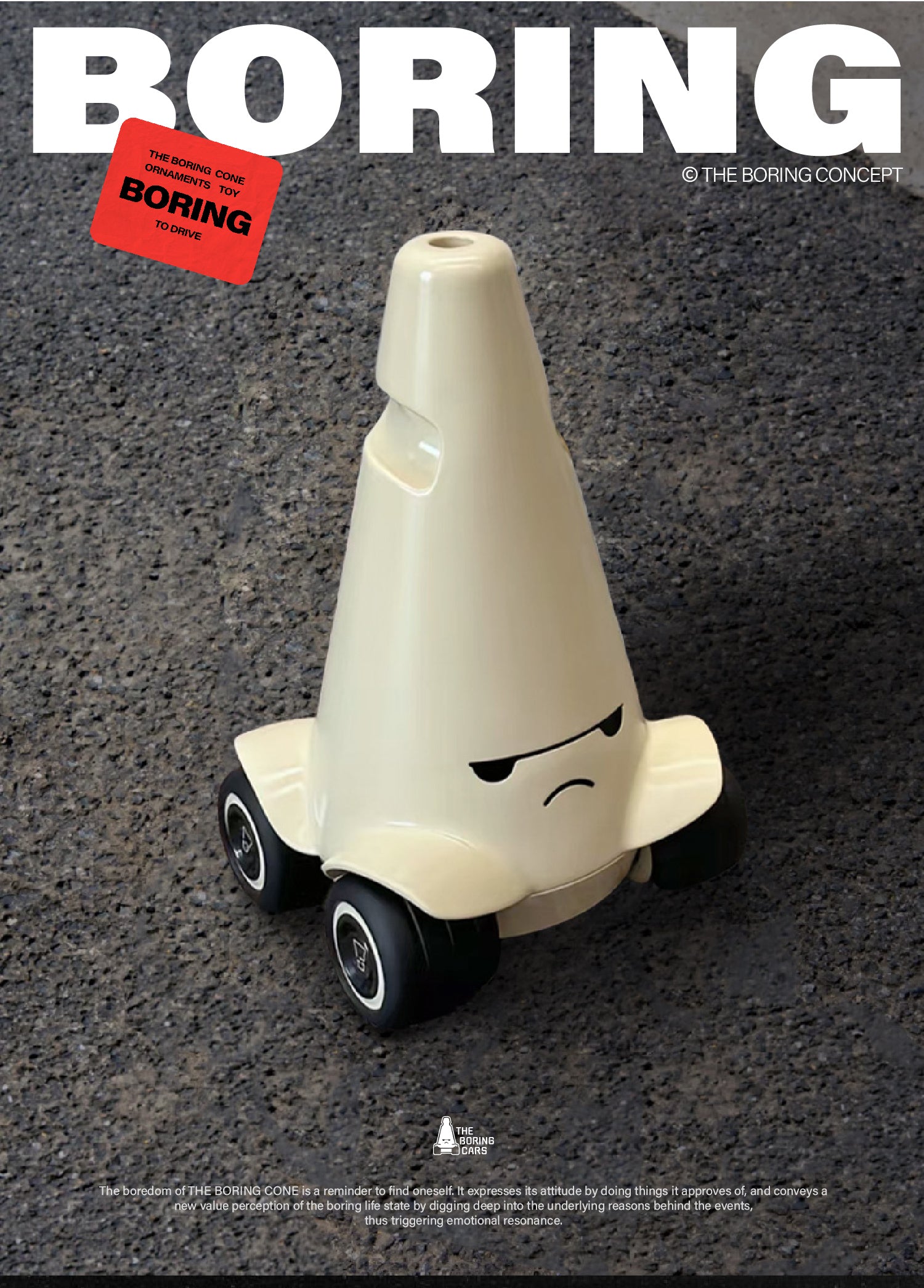 The boredom of THE BORING CONE is a reminder to find oneself. It expresses its attitude by doing things it approves of, and conveys a new value perception of the boring life state by digging deep into the underlying reasons behind the events, thus triggering emotional resonance.
